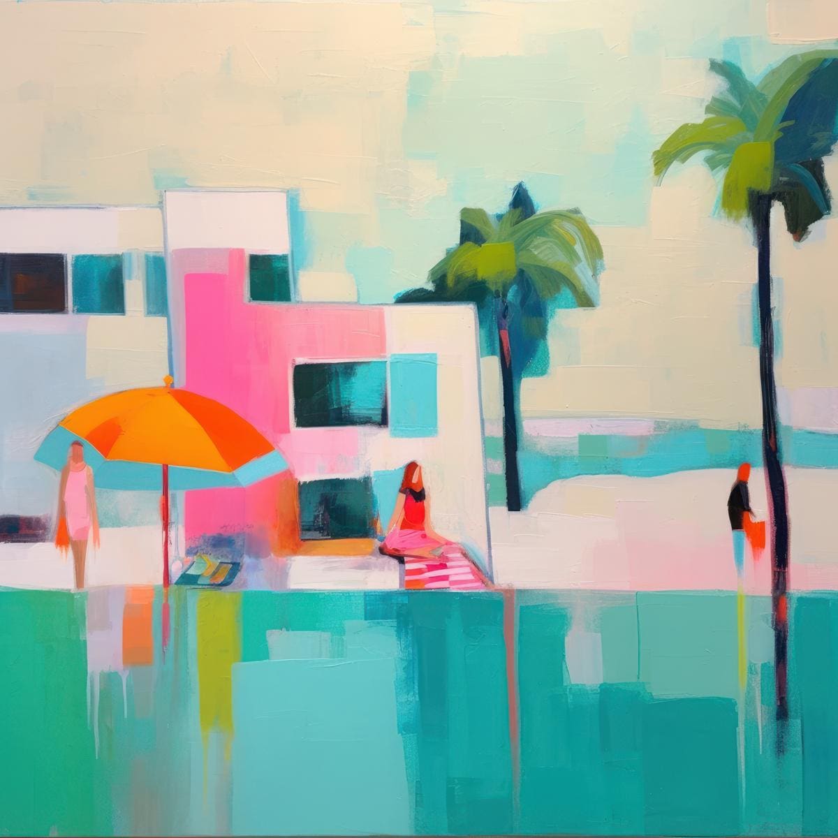 Soft geometric forms and bold color harmonies of coral, aqua, and citrus blend together with graceful palm silhouettes, capturing the relaxed elegance of modern beachside architecture. The result is a piece that radiates warmth, freedom, and contemporary sophistication.