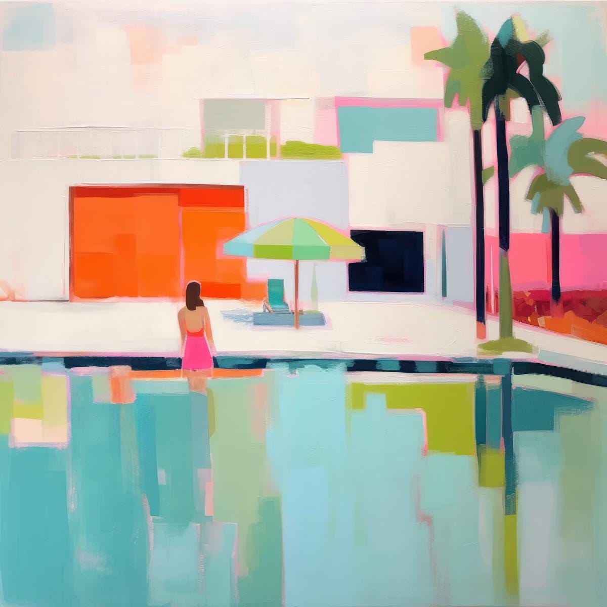 Set against a backdrop of soft turquoise water, coral-orange architecture, and pastel accents, a quiet figure stands near the pool, surrounded by the stillness of palm trees and ocean air.