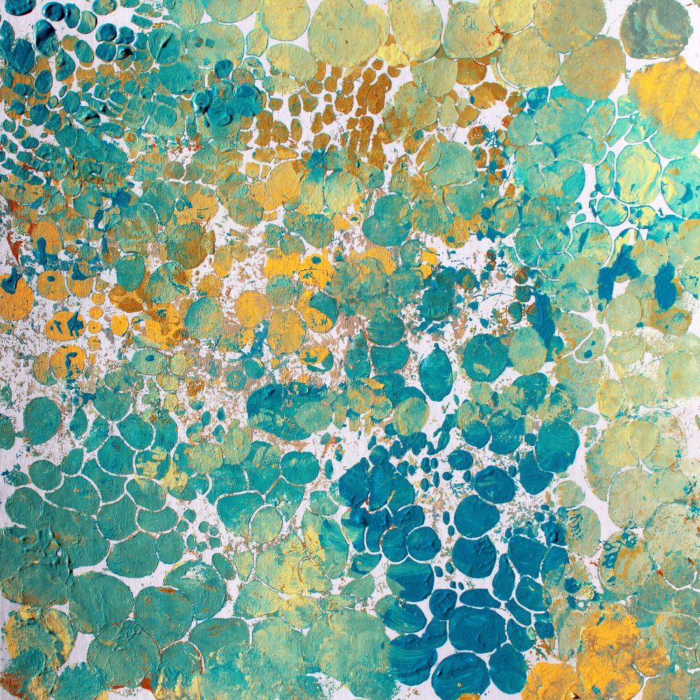 “Textured III” is a vibrant abstract artwork inspired by organic shapes, rhythmic movement, and the harmony of nature. Layers of turquoise, teal, gold, and soft green tones create a captivating flow of color, while circular impressions add a playful yet elegant sense of depth.