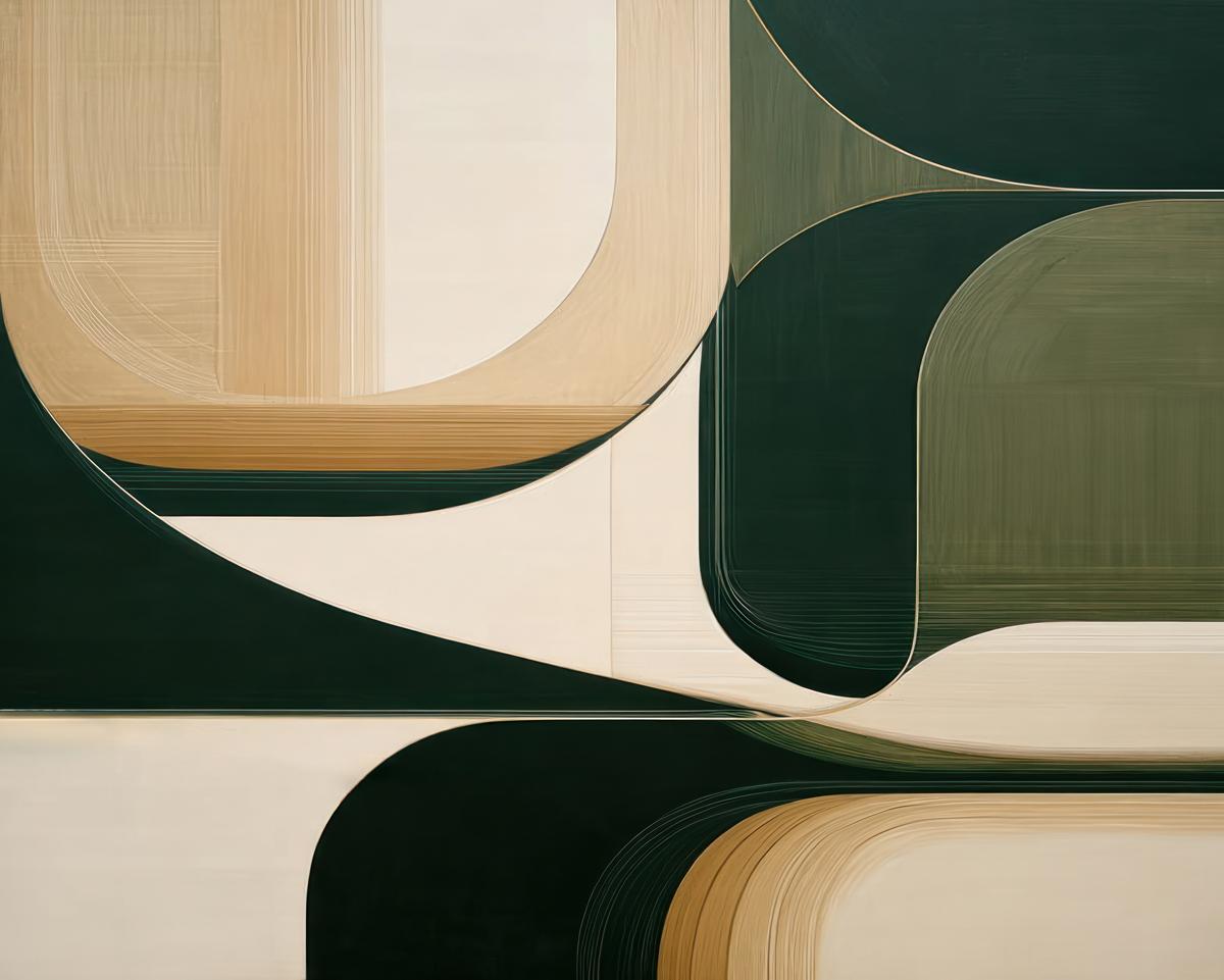 The composition features organic geometric forms, architectural curves, and layered brushwork, creating a calm and balanced visual rhythm. A refined palette of deep green, warm beige, and soft neutrals makes this artwork highly versatile for curated interiors.