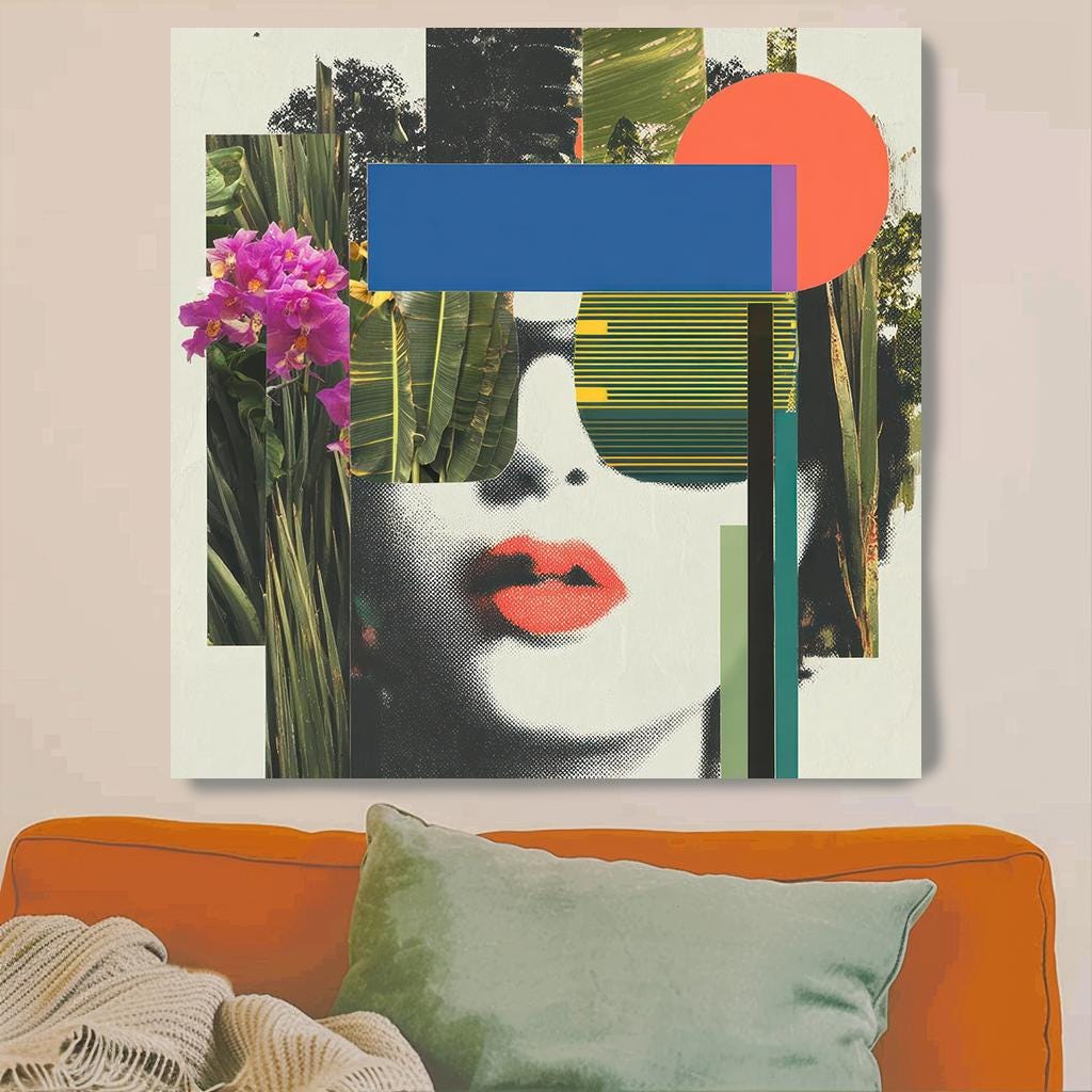 This contemporary mid-century modern canvas print blends abstract portraiture with tropical botanical elements, creating a bold yet sophisticated statement piece.