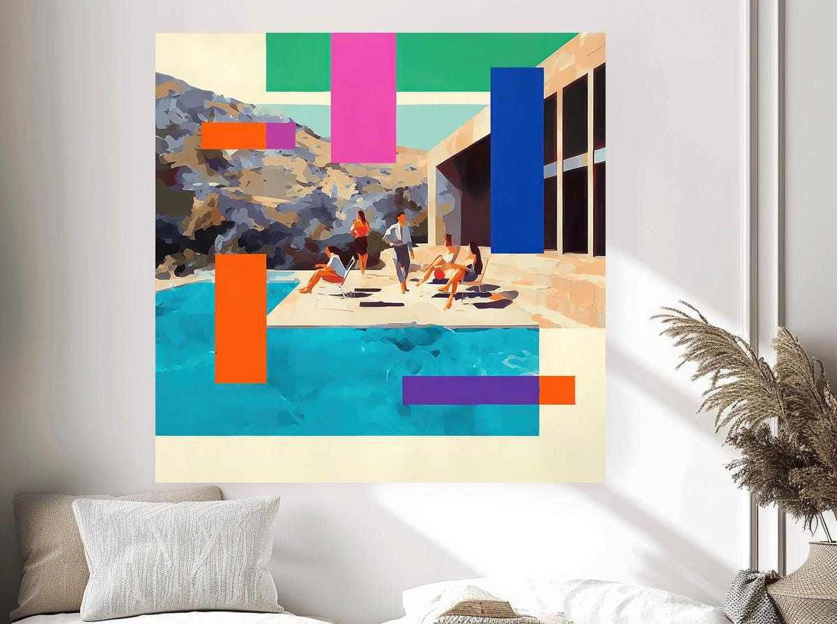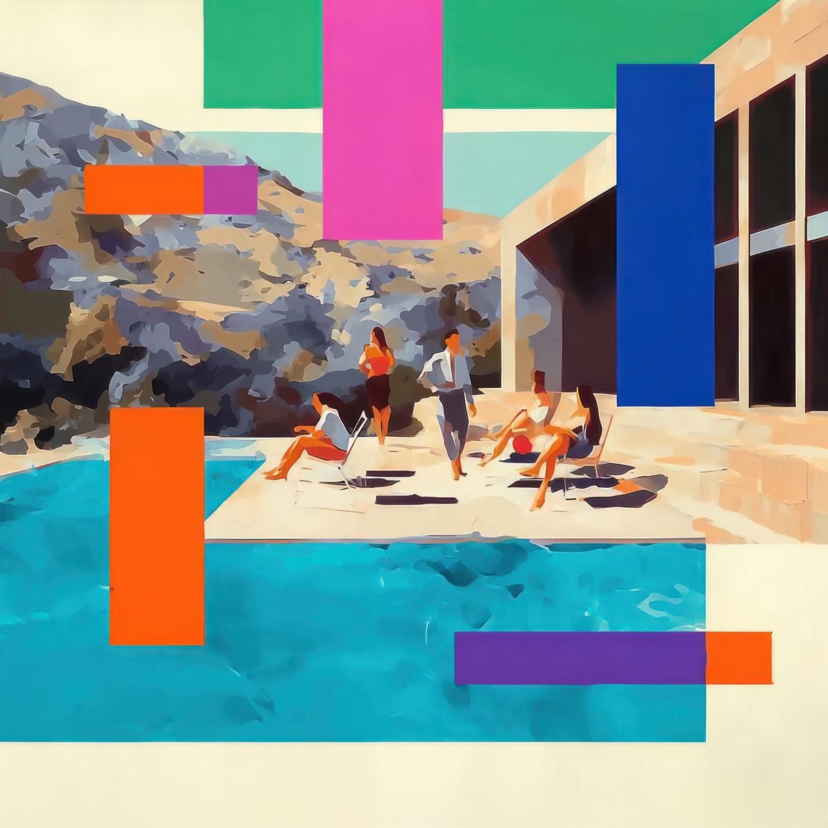 The composition blends coastal elegance with architectural abstraction, creating a refined yet lively atmosphere. Bright blues, warm neutrals, and vibrant accent colors evoke resort-style leisure while maintaining a clean, gallery-quality aesthetic.
